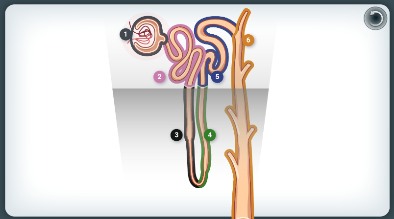 Symulacja przedstawia schemat układu moczowego. Na schemacie zaznaczone są cyframi poszczególne etapy powstawania moczu. Po kliknięciu w numerek pojawia się zadanie do ucznia - należy wybrać wszystkie poprawne odpowiedzi.
