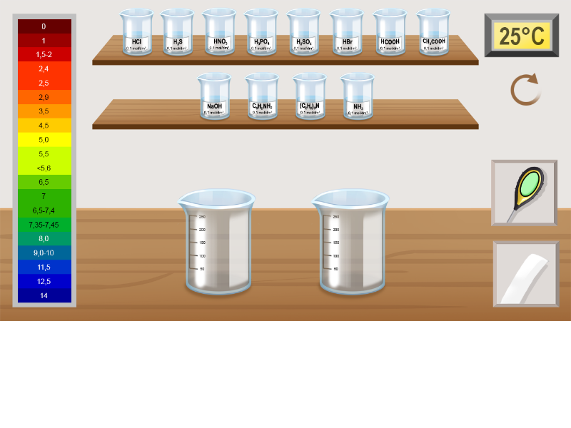 Do zlewek wlano przy pomocy pipet niewielką ilość wybranego kwasu lub zasady, w różnych zlewkach znajdowały się różne substancje. Następnie umieszczono w nich papierki wskaźnikowe, a później zmierzono pH każdej substancji przy pomocy pH–metru.