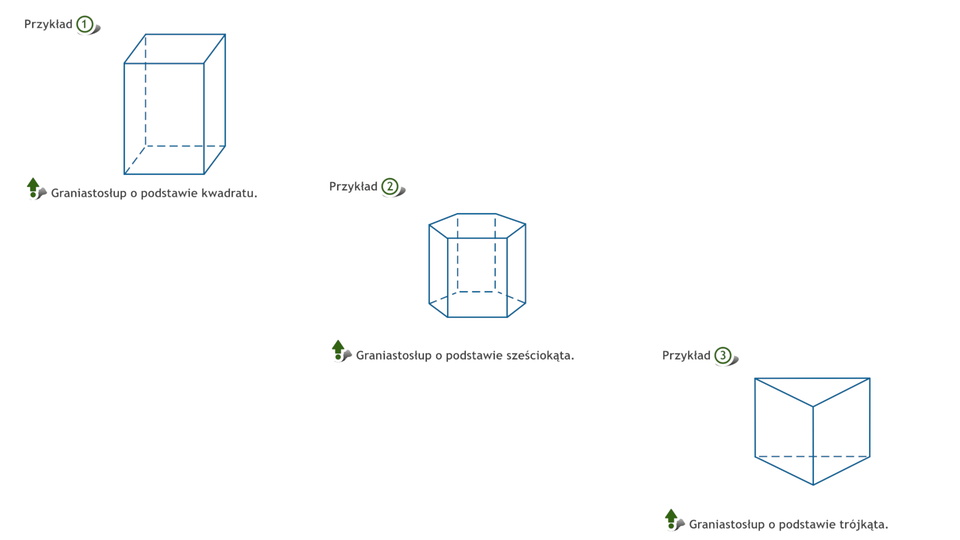 Animacja pokazuje przykłady trzech figur przestrzennych, które są graniastosłupami prostymi.