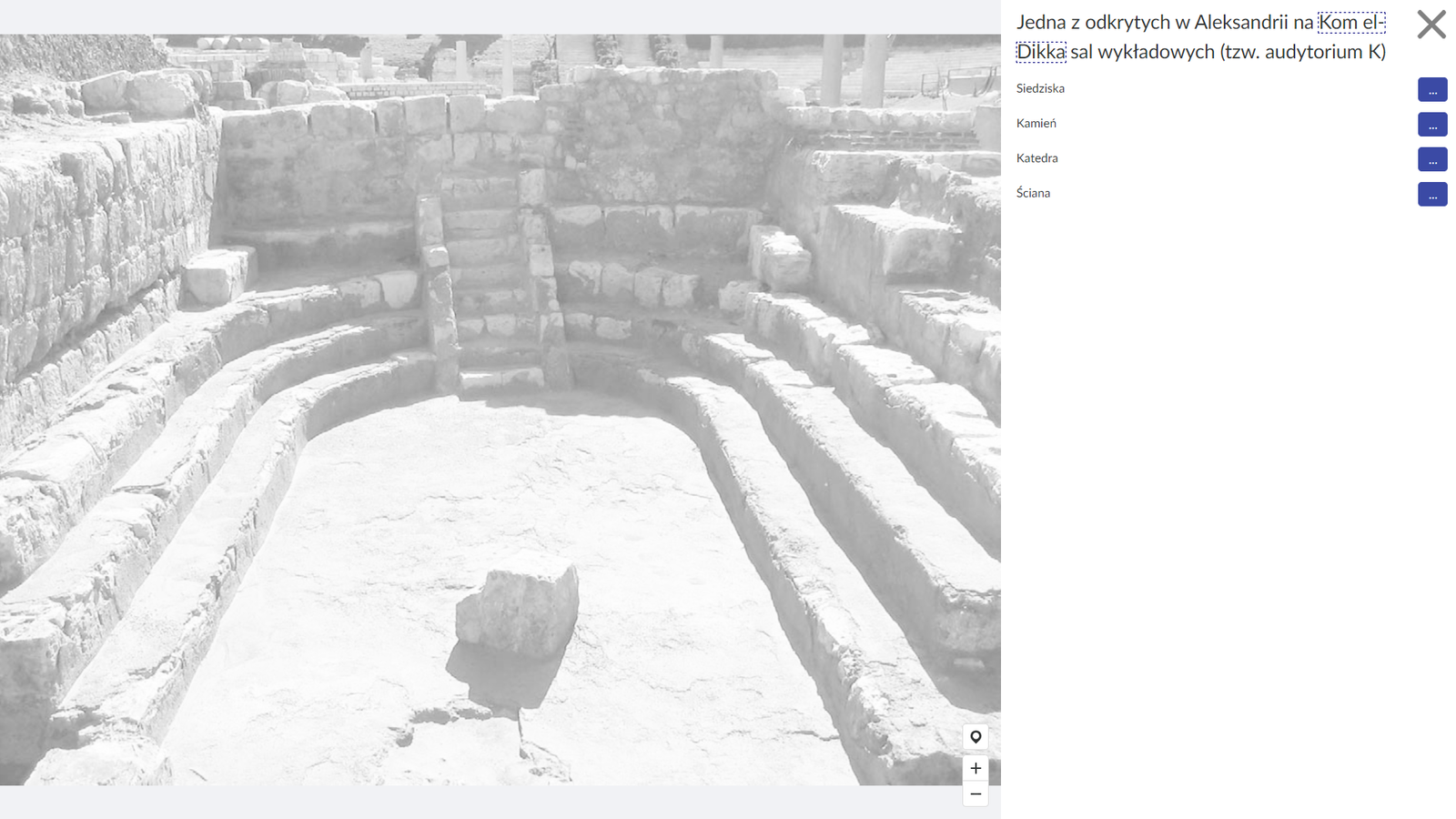 Ilustracja przedstawia fotografię jednej z odkrytych w Aleksandrii, na Kom el‑Dikka, sal wykładowych (tak zwanego audytorium K). Obraz jest wyszarzony i dopiero po kliknięciu na poszczególne pozycje w panelu bocznym, uwidocznione zostają odpowiednie fragmenty zdjęcia. Pierwszy element to Siedziska. Po kliknięciu w niego, na ilustracji ukazują się kamienne schody‑trybuny, ułożone w kształt półkola. Po kliknięciu w przycisk z wielokropkiem, znajdujący się obok nazwy, pojawia się informacja o wybranym elemencie. Siedziska - Ławy, miejsca siedzące dla uczniów. Kliknięcie na kolejny element w panelu bocznym - Kamień - uwidacznia na ilustracji duży kamień, znajdujący się na środku sceny. Jest dobrze widoczny z każdego miejsca siedzącego. Po kliknięciu w przycisk wielokropka, pokazuje się informacja: Kamień ustawiony w tym miejscu w wielu salach lekcyjnych – był albo podstawą drewnianego pulpitu (mównicy, z greckiego analogeion, z łacińskiego analogium), przy którym studenci wygłaszali mowy i wprawki, albo podstawą wyznaczonego miejsca, z którego studenci występowali. Po wybraniu kolejnego elementu z panelu bocznego - Katedry, na fotografii uaktywnia się fragment ze schodkami, prowadzącymi przez środek półkola siedzisk. Po kliknięciu w przycisk z wielokropkiem, ukazuje się okno z informacją: Katedra czyli krzesło (tron) nauczyciela (z greckiego thrónos), dodatkowo oddzielone kamiennym obramowaniem schodów, odpowiednio wywyższone w stosunku do ław dla uczniów. Ostatni element - Ściana - to fragment kamiennej konstrukcji, izolujący audytorium od reszty przestrzeni, znajdujących się w tle. Kliknięcie w ikonę z wielokropkiem powoduje wyświetlenie informacji: Ściana oddzielająca salę lekcyjną od innej, bliźniaczej sali lekcyjnej (tak zwane audytorium L).