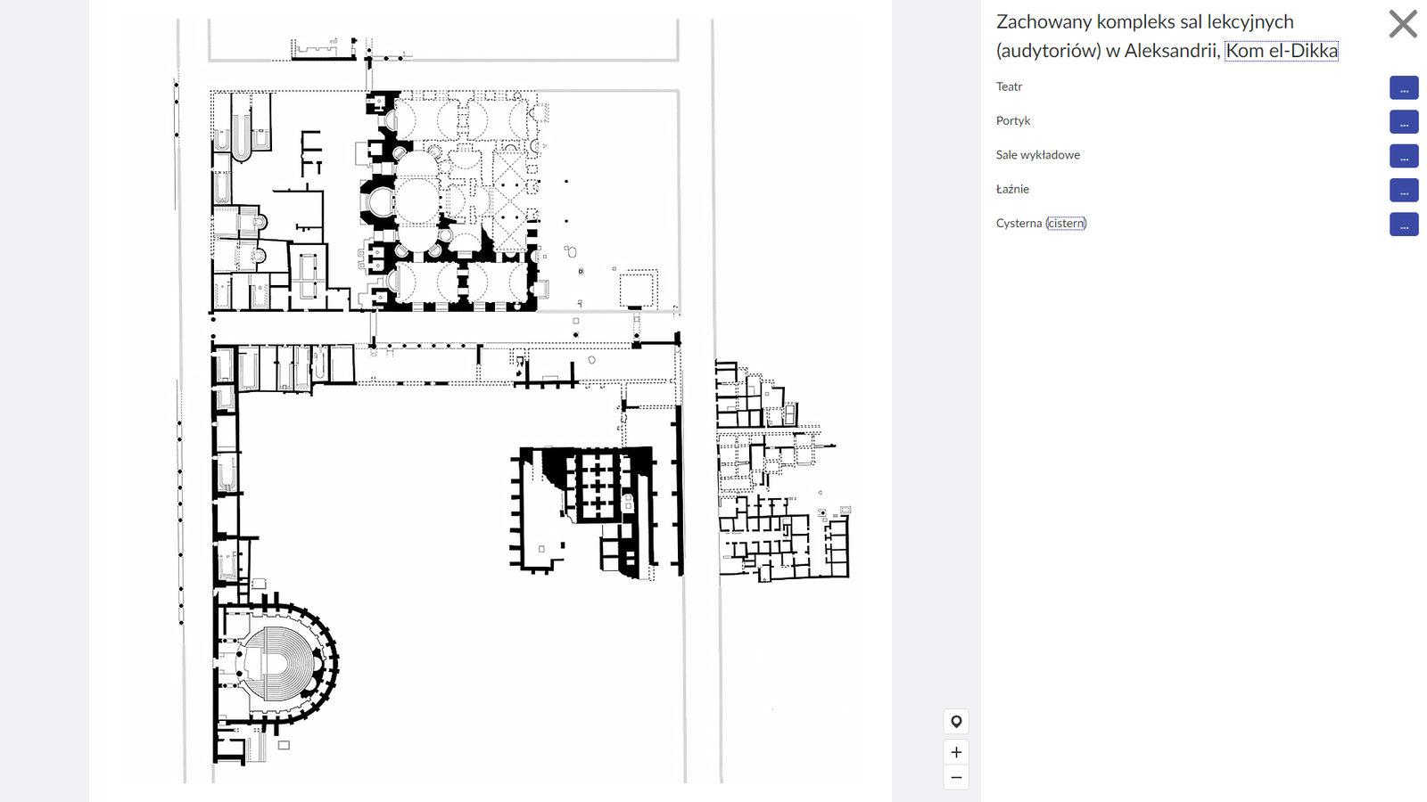 Ilustracja przedstawia plan architektoniczny zachowanego kompleksu sal lekcyjnych (audytoriów) w Aleksandrii, Kom el‑Dikka. Po prawej stronie ekranu znajduje się panel boczny z listą elementów, które widoczne są na planie. Po kliknięciu w pierwszą pozycję na liście - "Teatr", na ilustracji podświetla się na czerwono element w lewym, dolnym narożniku. Wyróżnia się półkolistym kształtem, zawiera scenę i, również ułożone w półkole, trybuny. Na panelu bocznym, obok nazwy omawianego elementu, znajduje się przycisk z wielokropkiem. Po jego kliknięciu, pojawia się okno z opisem danego elementu planu. Teatr - W późnym antyku pełnił też być może funkcję największej sali lekcyjnej i służył do wykonywania mów popisowych i wykładów dla większych grup uczniów. Drugą pozycją na liście jest Portyk. Po kliknięciu w nazwę, na planie zostaje podświetlony na czerwono fragment w kształcie litery F - pionowa, wąska przestrzeń w lewej części planu, rozciągająca się przez całą wysokość ilustracji, a także odchodzące od niej pod kątem prostym, dwie poziome, równoległe do siebie przestrzenie. Po kliknięciu w wielokropek, pojawia się informacja dodatkowa: Portyk - Ulica z kolumnadą, stanowiła wraz z pasażem północnym i południowym główne dojście do szkoły. Trzeci element planu to sale wykładowe. Po kliknięciu podświetlone są odpowiednie, prostokątne fragmenty usytuowane w lewej części kompleksu. Po kliknięciu w przycisk z wielokropkiem, wyświetla się informacja: Kompleks sal wykładowych dla kilkunasto- lub kilkudziesięcioosobowych grup uczniów. Były miejscem wykładania prawa, medycyny, filozofii, retoryki. Kliknięcie w kolejną pozycję "Łaźnie" powoduje podświetlenie na czerwono dużego obszaru w górnej, centralnej części planu, sąsiednio z salami wykładowymi. Po kliknięciu na przycisk z wielokropkiem pojawia się okno z informacją: Łaźnie - Ich bliskość kompleksowi sal lekcyjnych nie dziwi, ponieważ łaźnie były miejscem publicznych spotkań, dyskusji, miejscem częstych wizyt, lokowanym często w kluczowych miejscach miasta. Ostatnia pozycja w panelu bocznym to Cysterna. Jej kliknięcie powoduje podświetlenie na czerwono elementu w kształcie prostokąta, położonego w oddaleniu od reszty do tej pory wspomnianych pomieszczeń. Po kliknięciu na przycisk z wielokropkiem pojawia się dodatkowa informacja: Cysterna (cistern) - Zbiornik zapewniający zaopatrzenie w wodę dla całego kompleksu budynków.