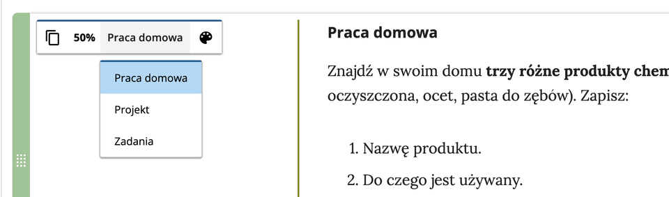 Jeśli z jakiś powodów potrzebne jest grupowanie kilku komponentów zadań i poleceń w jednym bloku, możemy użyć komponentu Grupa zadań, który podobnie jak Blok lekcyjny i Zadania i polecenia pozwala na łączenie różnych komponentów, ale w tym wypadku nadawane są im numery wewnętrzne np. 1.1, 1.2, 1.3*.*