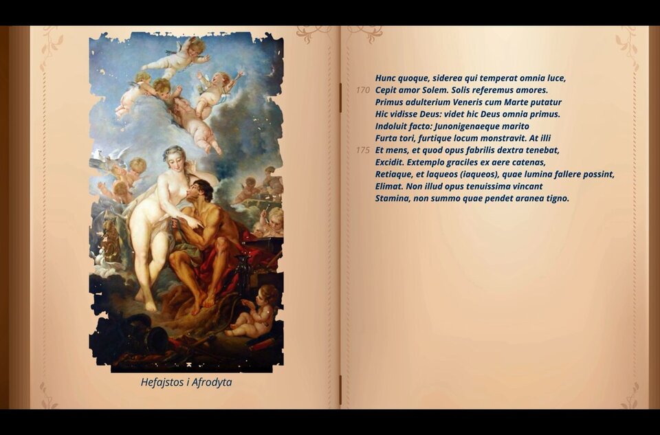 Film animowany Hefajstos. Film przedstawia dwie ilustracje, które pojawiają się w książce. Pierwsza z nich ukazuje Hefajstosa i Afrodytę. Druga ukazuje Wulkana zaskakującego Wenus i Marsa. Obok nich znajduje się tekst łaciński i jego polskie tłumaczenie: 1. Publius Ovidius Naso Metamorphoses libri XV Liber quartus 169-189 Hunc quoque, siderea qui temperat omnia luce, 170 Cepit amor Solem. Solis referemus amores. Primus adulterium Veneris cum Marte putatur Hic vidisse Deus: videt hic Deus omnia primus. Indoluit facto: Junonigenaeque marito Furta tori, furtique locum monstravit. At illi 175 Et mens, et quod opus fabrilis dextra tenebat, Excidit. Extemplo graciles ex aere catenas, Retiaque, et laqueos (iaqueos), quae lumina fallere possint, Elimat. Non illud opus tenuissima vincant Stamina, non summo quae pendet aranea tigno. Tłumaczenie: Któż nie kochał? Ten nawet co oświeca Nieba, Feb poznał miłość. Powiem o miłostkach Feba. On pierwszy dostrzegł zwiąsków Wenery z Gradywem, On cały świat przegląda okiem przenikliwem. Zbrodnią i miejsce zbrodni, tą zdradą zgorszony, Wyjawił przed jej mężem a synem Junony. Na ten widok zbladł Wulkan, a mimo kowadła Żarząca się robota z rąk jego wypadła; Wziął się do innej; z miedzi ciągnie sztuką dzielną, Niedojrzałe łańcuszki, i siatkę subtelną; Ani przędza utkana z najwątlejszych nici, Ani się tą cienkością pajęczyna szczyci. 2. 180 Utque leves tactus, momentaque parva sequantur, Efficit: et lecto circumdata collocat apte. Ut venere torum conjux et adulter in unum; Arte viri, vinclisque nova ratione paratis, In mediis ambo deprensi amplexibus haerent. 185 Lemnius extemplo valvas patefecit eburnas; Admisitque Deos. Illi jacuere ligati Turpiter: atque aliquis de Dis non tristibus optat Sic fieri turpis. Superi risere; diuque Haec fuit in toto notissima fabula coelo. Tłumaczenie: Siatkę w około łóżka tak opiął dokładnie, Że choćby za najmniejszem poruszeniem spadnie. Ledwie się kochankowie w to łoże pokładli, Natychmiast w sidła na nich zastawione wpadli, I w roskosznem objęciu zalegli oboje. Wulkan zwołanym Bogom otworzył podwoje: Gdy ci się wstydzą, tamci żartują Bogowie, Jeden z Bożków swawolnych tak do Marsa powie: Oby zemnie szydzili jak dziś szydzą z ciebie! Długo z tego wypadku żartowano w niebie.