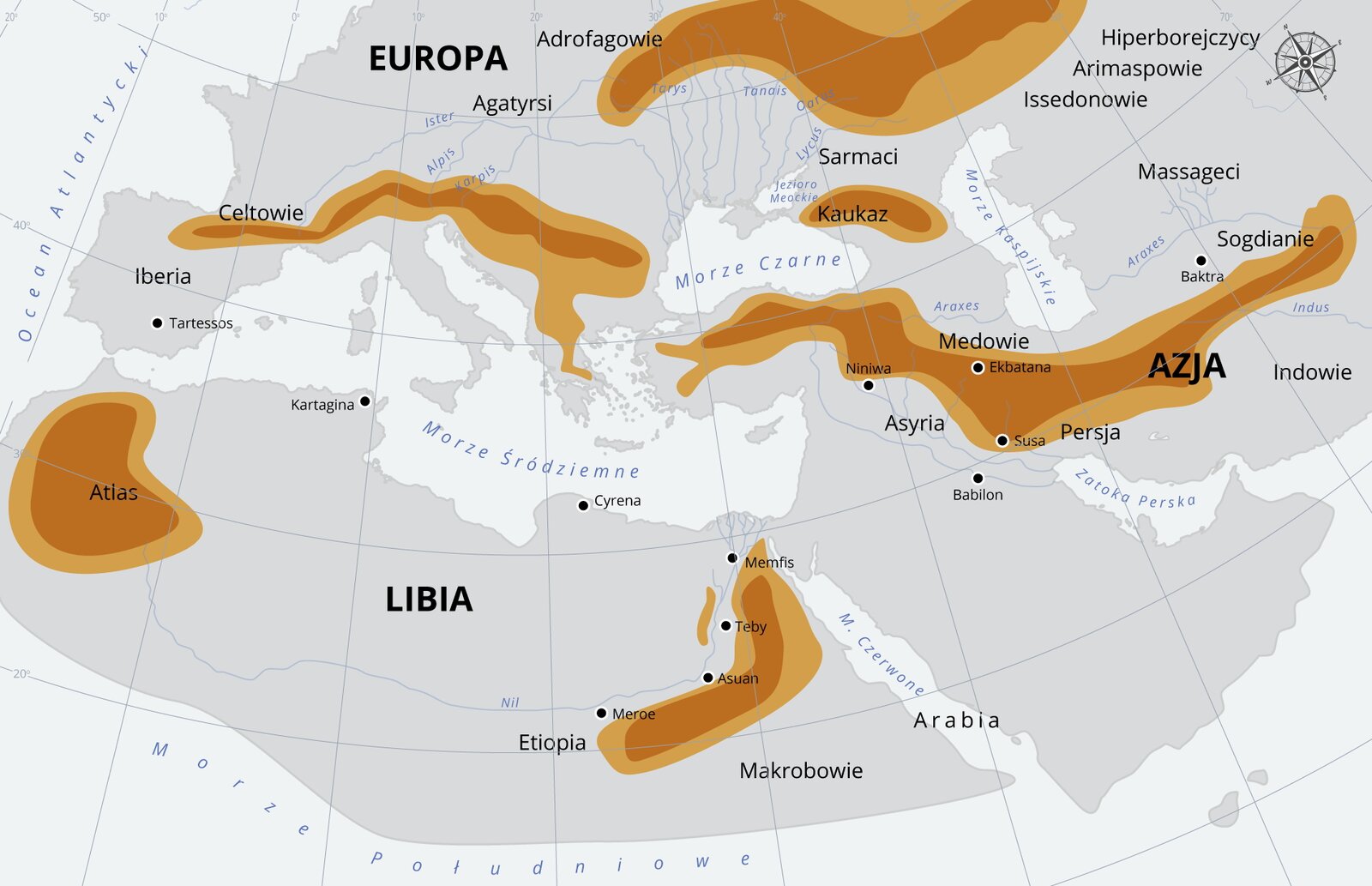 Zapoznaj się z mapą znanego w czasach Herodota świata. Klikając w poszczególne miejsca na mapie dowiesz się, co o tych krainach i ludach pisał grecki historyk.