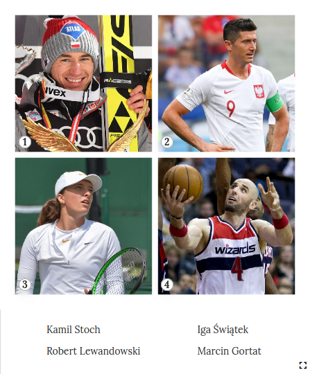 Ilustracja przedstawia cztery zdjęcia polskich sportowców. Każdemu z nich przypisany jest punkt interaktywny, w którym znajduje się zapisane imię i nazwisko oraz plik audio. Transkrypcja do nagrań znajduje się poniżej ilustracji. Na pierwszym zdjęciu widzimy Kamila Stocha w czapce, kurtce, z nartami w dłoniach i medalami na szyi. Na drugim zdjęciu widzimy Roberta Lewandowskiego w białej koszulce polskiej reprezentacji, z godłem i numerem dziewiątym. Na trzecim zdjęciu widzimy Igę Świątek w dresie, czapce z daszkiem i rakietą do tenisa w dłoni. Na czwartym zdjęciu widzimy Marcina Gortata w koszulce bez rękawów i piłką do koszykówki w dłoniach.