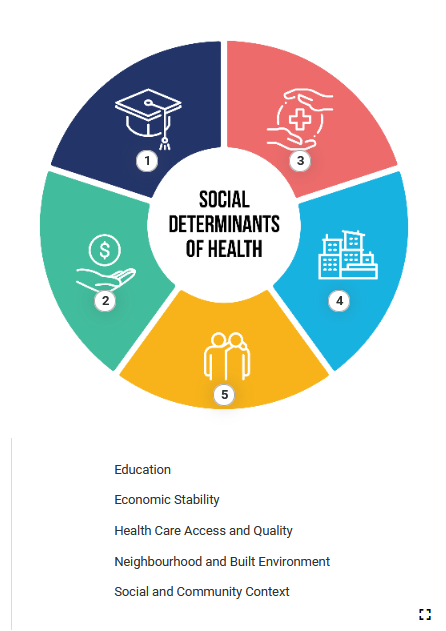 Ilustracja przedstawia wykres kołowy składający się z pięciu pól w kolorze czerwonym, niebieskim, żółtym, zielonym i granatowym. Na każdym polu widoczny jest symbol. Pośrodku widoczne jest białe koło z napisem z czarnych liter w języku angielskim: SOCIAL DETERMINANTS OF HEALTH.