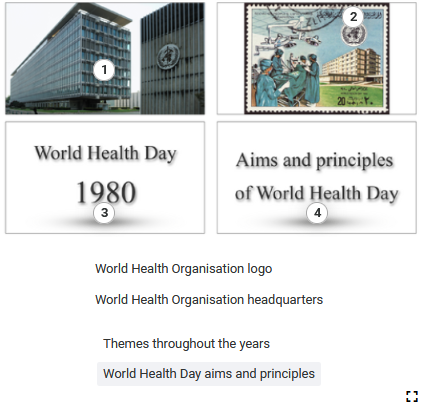 Grafika składa się z czterech zdjęć. Zdjęcie nr 1 przedstawia budynek Światowej Organizacji Zdrowia. Widoczny jest napis THE WHO HEADQUARTERS. Transkrypcja znajduje się poniżej. Zdjęcie nr 2 przedstawia znaczek pocztowy, na którym widoczny jest zespół lekarzy przy operacji oraz budynek Światowej Organizacji Zdrowia. Widoczny jest napis WORLD HEALTH ORGANISATION LOGO. Transkrypcja znajduje się poniżej. Zdjęcie nr 3 zawiera tekst w języku angielskim: WORLD HEALTH DAY 1980.Widoczny jest napis THEMES THROUGHOUT THE YEARS. Transkrypcja znajduje się poniżej. Zdjęcie nr 4 zawiera tekst w języku angielskim: AIMS AND PRINCIPLES OF WORLD HEALTH DAY. Widoczny jest napis WORLD HEALTH DAY AIMS AND PRINCIPLES. Transkrypcja znajduje się poniżej.