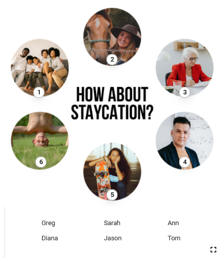 Ilustracja zawiera czarny napis na białym tle: HOW ABOUT STAYCATION, oraz sześć zdjęć w kółkach. Ilustracja posiada sześć punktów interaktywnych, po naciśnięciu których pojawia się nagranie. Transkrypcja do nagrań znajduje się poniżej.