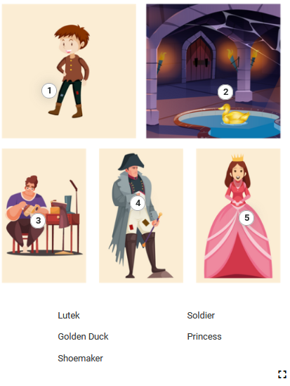 Grafika zawiera pięć ilustracji, które posiadają punkty interaktywne, po naciśnięciu których pojawiają się tekst oraz nagrania. Transkrypcja do nagrań znajduje się poniżej. Ilustracja nr 1 Lutek. Chłopiec w wieku wczesnoszkolnym ubrany w średniowieczny strój. Ilustracja nr 2 Golden Duck. W oczku wodnym znajdującym się w podziemiach pływa złota kaczka. Ilustracja nr 3 Shoemaker. Szewc naprawia buty. Ilustracja nr 4 Soldier. Mężczyzna ubrany w mundur. Ilustracja nr 5 Princess. Księżniczka ubrana w różową suknię z koroną na głowie.