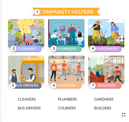 Grafika zawiera sześć ilustracji pokazujących różne zawody. Grafika posiada siedem punktów interaktywnych, po naciśnięciu których pojawiają się tekst oraz nagrania. W każdym punkcie, znajduje się miniatura ilustracji. Transkrypcja do nagrań znajduje się poniżej.