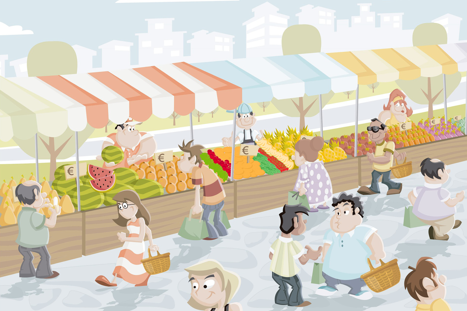 Découvre les conversations au marché alimentaire et fais les activités qui suivent.