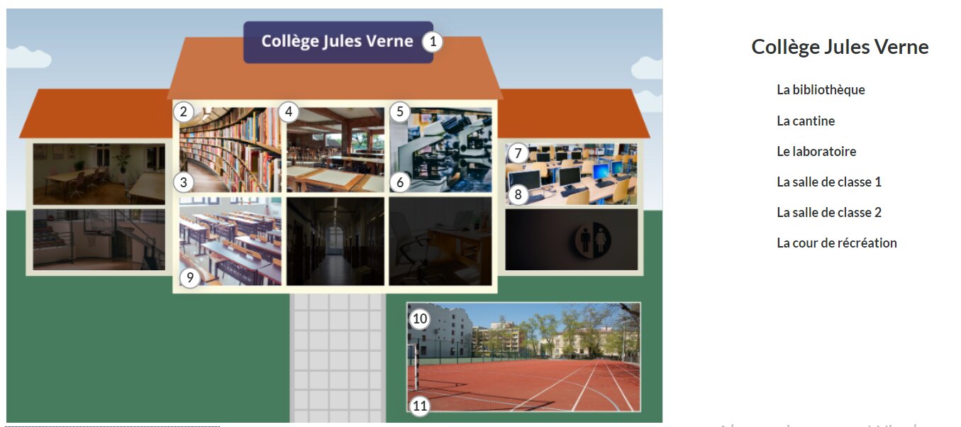 Ilustracja interaktywna przedstawia przekrój szkoły, w której znajdują się następujące pomieszczenia: pokój nauczycielski, sala gimnastyczna, biblioteka, klasa szkolna, stołówka, laboratorium, sekretariat, sala informatyczna, toalety, a także korytarz i dziedziniec szkolny. Siedem miejsc zostało podświetlonych. co umożliwia otworzenia okna z dodatkową treścią. Są to: biblioteka, stołówka, laboratorium, klasa szkolna, sala informatyczna oraz dziedziniec szkoły. Po kliknięciu w podświetlone pomieszczenie pojawiają się okno z mini‑komiksem oraz odtwarzane jest nagranie. Dodatkowo możliwe jest kliknięcie w tablicę z nazwą szkoły.