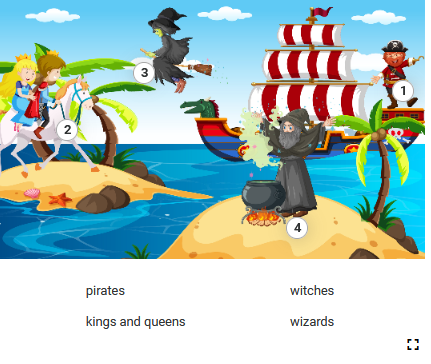 Ilustracja przedstawia morze, na którym są dwie wysepki z palmami. Na morzu płynie statek piracki. Na statku stoi pirat. Na wyspie z lewej strony znajduje się król z królową na białym koniu. Na drugiej wyspie znajduje się czarodziej oraz kocioł, z którego wydobywa się dym. Czarodziej ma uniesione ręce do góry. Widoczna jest również czarownica latająca na miotle. Ilustracja posiada 4 punkty interaktywne po naciśnięciu, których pojawiają się tekst oraz nagrania. Transkrypcja tekstu i nagrań, znajduje się pod ilustracją. Pirates: Pirat ma zamiast dłoni hak. Na głowie ma czapkę piracką z trupią czaszką. Ma rude włosy i rudą brodę. Kings and queens: Król w koronie i pelerynie, wiezie królową na białym koniu. Witches: Wiedźma ma zieloną skórę, i długą spiczastą czapkę. Leci na miotle. Wizards: Czarodziej ma spiczastą czapkę i długi czarny płaszcz. Pod jego kociołkiem płonie ogień.