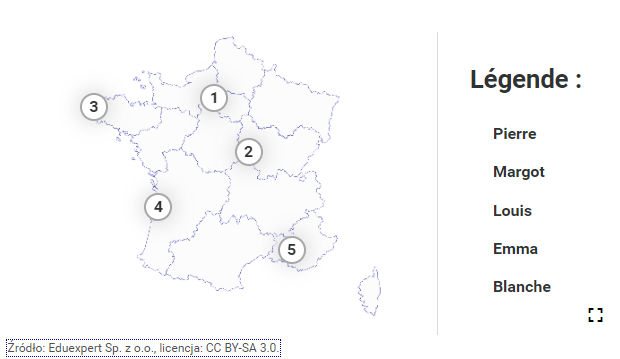 Ilustracja przedstawia mapę Francji podzieloną na regiony. Widnieją na niej cyfry od 1 do 5, a obok legenda z imionami ludzi.