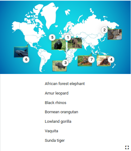 Ilustracja przedstawia mapę geograficzną świata, na której umieszczono fotografie zwierząt. Widoczne są zdjęcia orangutana, goryla, tygrysa saudyjskiego, słonia, leoparda, nosorożca czarnego i morświn kalifornijski. Ilustracja posiada siedem punktów interaktywnych, po naciśnięciu których pojawiają się tekst oraz nagrania. Transkrypcja do nagrań znajduje się poniżej.