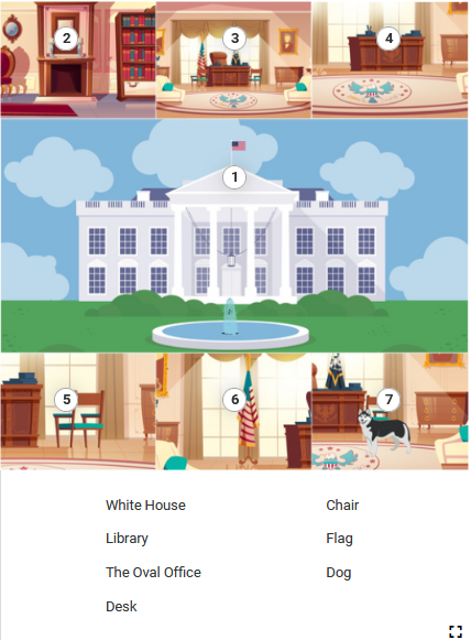 Grafika składa się z siedmiu ilustracji. Ilustracja nr 1 przedstawia budynek Białego Domu siedziby prezydenta Stanów Zjednoczonych. Pod cyfrą nr 1 widoczny napis WHITE HOUSE oraz audio [odtwórz]. Ilustracja nr 2 przedstawia bibliotekę, w której widoczny jest kominek oraz regał z książkami. Pod cyfrą 2 widoczny napis LIBRARY oraz audio [odtwórz]. Ilustracja nr 3 przedstawia Gabinet Owalny, w którym widoczne jest biurko oraz fotel. Z lewej strony biurka stoi flaga Stanów Zjednoczonych. Pod cyfrą 3 widoczny jest napis THE OVAL OFFICE oraz audio [odtwórz]. Ilustracja nr 4 to biurku w Gabinecie Owalnym. Pod cyfrą 4 napis DESK oraz audio [odtwórz]. Ilustracja nr 5 przedstawia krzesło w Gabinecie Owalnym. Pod cyfrą 5 napis CHAIR oraz audio [odtwórz]. Ilustracja nr 6 przedstawia flagę Stanów Zjednoczonych stojącą w Gabinecie Owalnym. Po cyfrą 6 napis FLAG oraz audio [odtwórz]. Ilustracja nr 7 przedstawia psa znajdującego się w Gabinecie Owalnym. Pod cyfrą 7 napis DOG oraz audio [odtwórz].