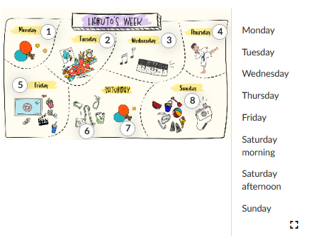 Ilustracja interaktywna przedstawia grafikę ukazującą różne dni tygodnia i rysunki oznaczające czynności, które są do nich przypisane. Ilustracja jest podpisana Haruto’s week . Każdy z dni ma przypisany punkt interaktywny z tekstem i jego zapisem audio do odsłuchania. Dzień podpisany Monday ma przy sobie grafiki przedstawiające dwie rakietki i piłeczki do ping‑ponga oraz punkt interaktywny z nagraniem o treści I play table tennis with my dad on Monday.. Dzień podpisany Tuesday ma przy sobie grafiki przedstawiające tubki z farbami, paletę, pędzelki, kredki i obrazek oraz punkt interaktywny z nagraniem o treści I have a drawing class with my sister on Tuesday. . Dzień podpisany Wednesday ma przy sobie grafiki przedstawiające kibord i nutki oraz punkt interaktywny z nagraniem o treści I have a piano lesson on Wednesday.. Dzień podpisany Thursday ma przy sobie grafikę przedstawiającą chłopca w kimonie i czarnym pasie, ćwiczącego sztuki walki oraz punkt interaktywny z nagraniem o treści I go to a karate class with my sister on Thursday. I don’t practise karate, but I take photos of my sister.. Dzień podpisany Friday ma przy sobie grafiki przedstawiające telewizor, pilot, klaps filmowy, kubek z napojem i kubełek popkornu oraz punkt interaktywny z nagraniem o treści My friends come to my house and we watch films on Friday afternoon. Dzień podpisany Saturday ma przy sobie grafiki przedstawiające odkurzacz, spryskiwacz do szyb, wiadro i gąbkę, a obok rakietki i piłki pingpongowe. Grafikom towarzyszą dwa punkty interaktywne o treściach I tidy up my bedroom on Saturday morning. oraz On Saturday afternoon, I play table tennis with my dad again. I like playing table tennis. . Dzień podpisany Sunday ma przy sobie grafiki przedstawiające sprzęt do pływania, wiaderko, łopatkę, lody w rożu, kawałek arbuza i aparat fotograficzny oraz punkt interaktywny z nagraniem o treści We go to the beach on Sunday. I take photos on the beach on Sunday.,