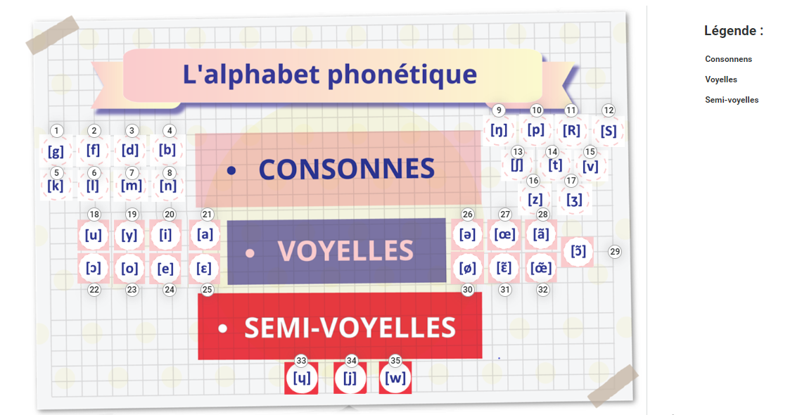 Na ilustrację składa się tytuł: L’alphabet phonétique i trzy koła w różnych kolorach, w których znajdują się wypisane głoski. Po prawej stronie znajduje się legenda, w której znajdują się klikalne elementy.