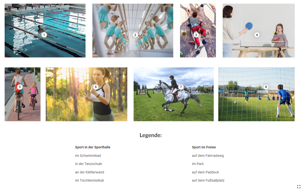 2. Die Tischtennisspielerin spielt 1. in der, 2. im, 3. auf dem, 4. im, 5. auf dem Tischtennisklub.
