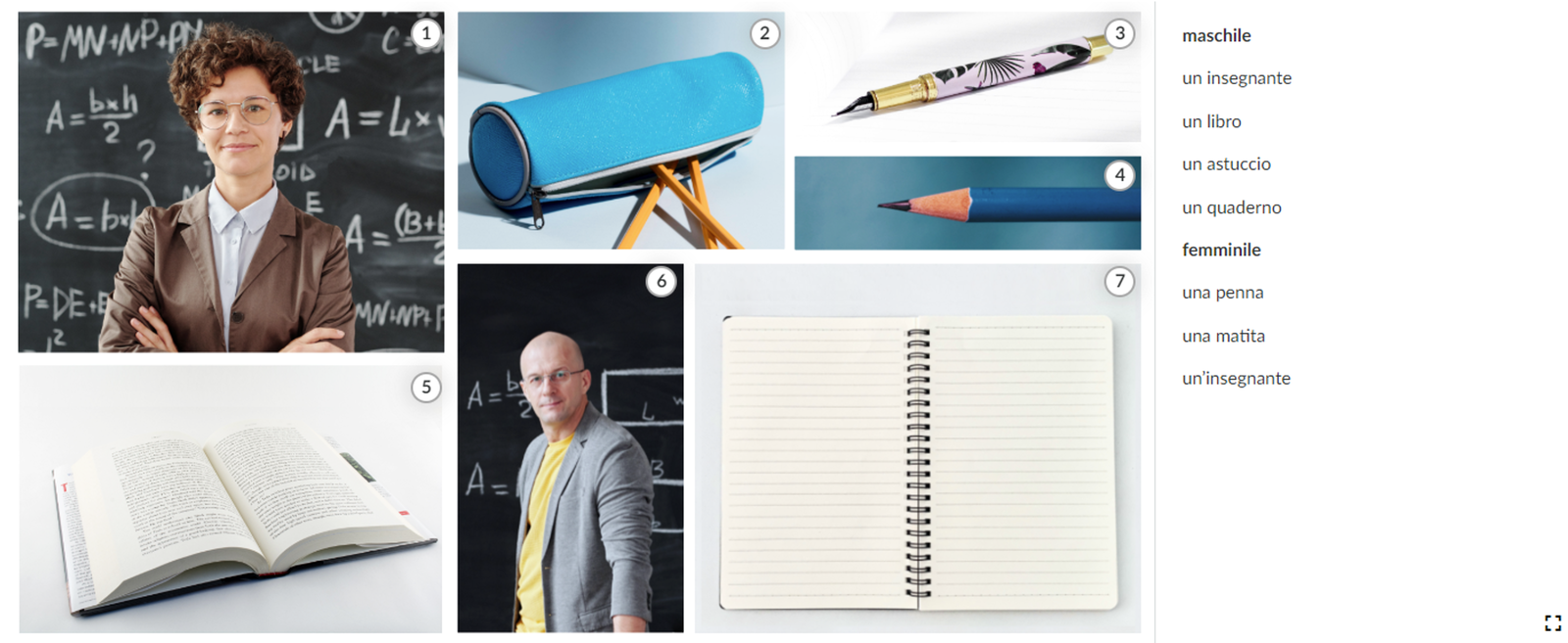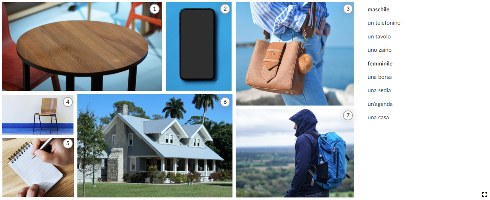 singolare maschile - rodzaj męski Możliwe odpowiedzi: 1. un astuccio, 2. una borsa, 3. un’agenda, 4. un telefonino, 5. uno zaino, 6. una sedia, 7. un libro, 8. una matita, 9. una casa, 10. un tavolo singolare femminile - rodzaj żeński Możliwe odpowiedzi: 1. un astuccio, 2. una borsa, 3. un’agenda, 4. un telefonino, 5. uno zaino, 6. una sedia, 7. un libro, 8. una matita, 9. una casa, 10. un tavolo