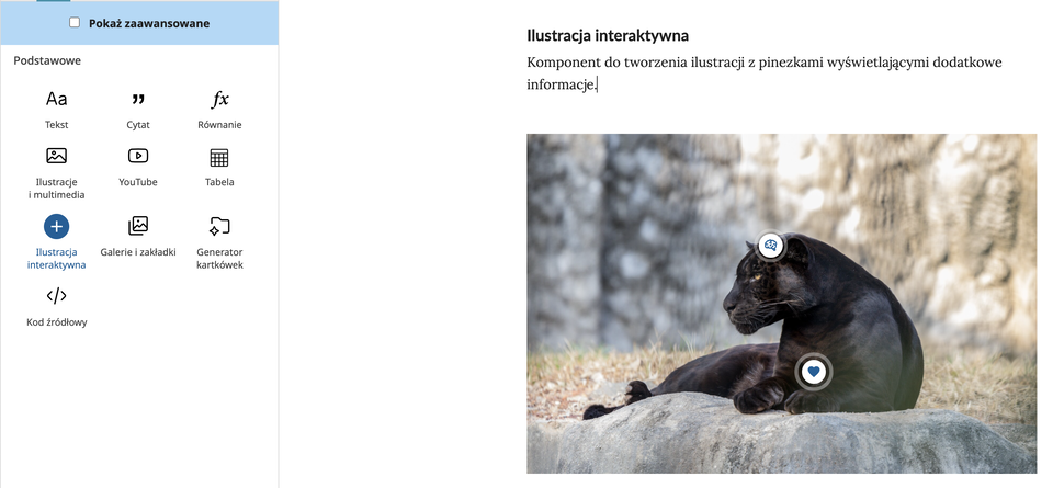 Komponent do tworzenia ilustracji z pinezkami (znacznikami) wyświetlającymi dodatkowe informacje. Kliknięcie ikony Ilustracja interaktywna powoduje dodanie na obszarze roboczym przykładowej ilustracji do dostosowania.