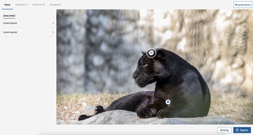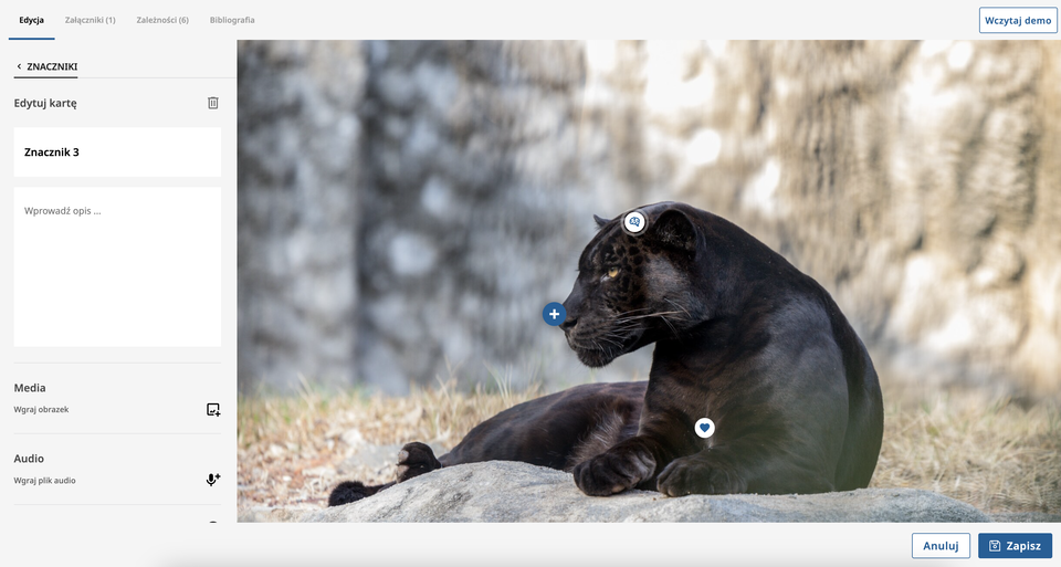 Aby edytować znacznik (pinezkę), klikamy go. Nowe znaczniki dodajemy klikając na zdjęciu w miejscach, w którym chcemy je umieścić. Znaczniki można swobodnie przemieszczać przeciągając je.