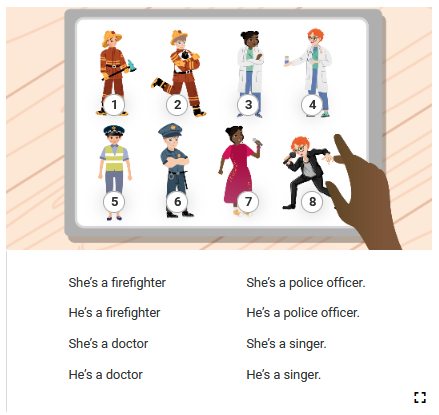 Ilustracja posiada osiem punktów interaktywnych, po naciśnięciu których pojawiają się nagrania. Transkrypcja do nagrań znajduje się poniżej.