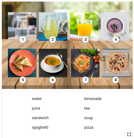 Grafika zawiera osiem zdjęć z jedzeniem i napojami. Posiada osiem punktów interaktywnych, po naciśnięciu których pojawiają się tekst oraz nagrania. Transkrypcja do nagrań znajduje się poniżej. Zdjęcie nr 1 I’m thirsty! Here’s some water. Na zdjęciu widoczny dzbanek z wodą. Zdjęcie nr 2 I’m thirsty! Here’s some lemonade.Na zdjęciu widoczny dzbanek z lemoniadą. Zdjęcie nr 3 I’m thirsty! Here’s some juice. Na zdjęciu widoczna szklanka z sokiem w kolorze pomarańczowym. Zdjęcie nr 4 I’m thirsty! Here’s some tea. Na zdjęciu widoczna filiżanka, w której parzy się torebka z herbatą. Zdjecie nr 5 I’m hungry! Here’s a sandwich. Na zdjęciu widoczne dwie trójkątne kanpki. Zdjęcie nr 6 I’m hungry! Here’s some soup. Na zdjęciu widoczny talerz głęboki z zupą. zdjęcie nr 7 I’m hungry! Here’s some spaghetti. Na zdjęciu widoczne spagetti z pomidorkami i listkami bazyli. Zdjęcie nr 8 I’m hungry! Here’s some pizza. Na zdjęciu widoczna pizza.