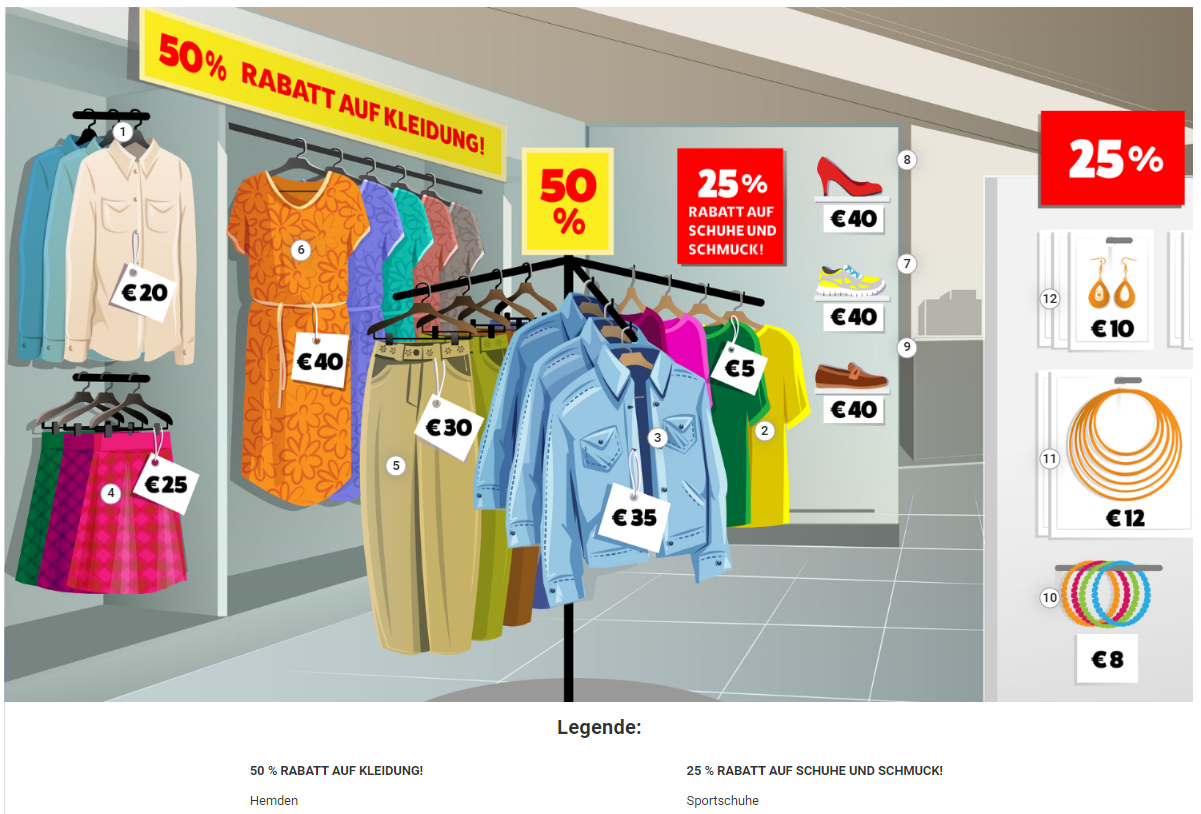 Welche Sonderangebote bietet der Laden auf der interaktiven Illustration? Markiere: richtig oder falsch.
