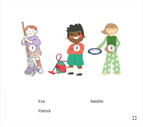 Ilustracja przedstawia postacie dzieci. Od lewej nr 1 widoczna jest dziewczynka z mopem do mycia podłogi w dłoni. Transkrypcja znajduje się poniżej. Nr 2 obok widoczny jest chłopiec z odkurzaczem. Transkrypcja znajduje się poniżej. Nr 3 ostatnia jest dziewczynka z talerzem w dłoni. Transkrypcja znajduje się poniżej. Pod ilustracją widoczne są imiona: Eva, Patrick i Natalie.