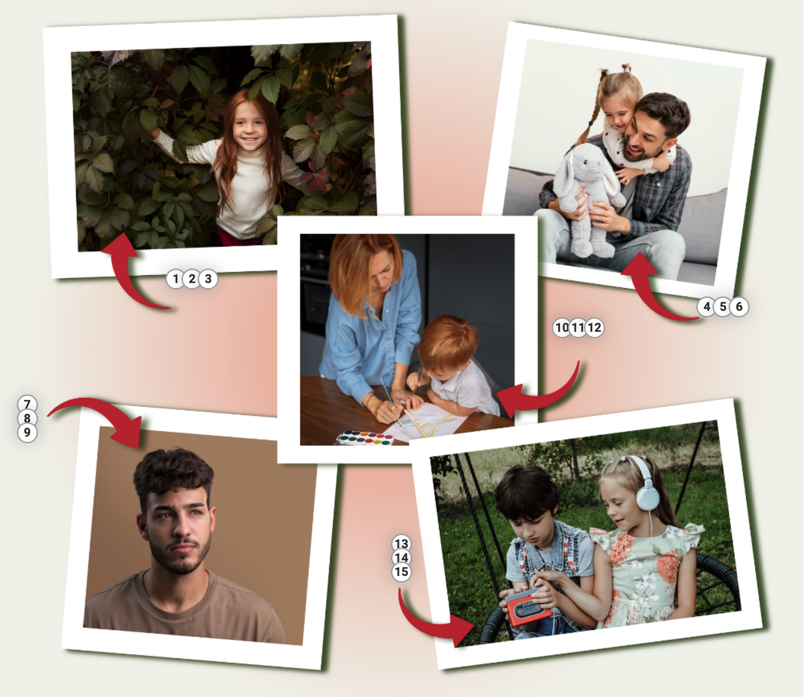 Ilustracja interaktywna przedstawia pięć fotografii na jasnym tle. Znajdują się przy nich czerwone strzałki z punktami interaktywnymi. Punkty interaktywne zawierają nagranie dźwiękowe (plik audio), które są tożsame z transkrypcją.