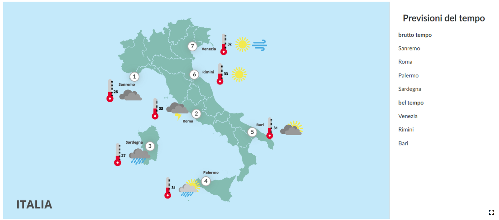 Ilustracja interaktywna „Italia” przedstawia mapę pogodową Włoch. Siedem miast oznaczonych jest numerami. Przy nazwie każdego z tych miast znajduje się symbol termometru z zaznaczoną temperaturą. Obok znajduje się symbol określający rodzaj pogody jaka tam występuje: symbol słońca, wiatru, chmur, burzy. Po prawej stronie znajduje się lista miast zaznaczonych na mapie. Miasta są podzielone na dwie grupy. Zła pogoda, po włosku „brutto tempo” jest w Sanremo, Rzymie, Palermo i na Sardynii. Dobra pogoda, po włosku „bel tempo” jest w Wenecji, Rimini i Bari. Po kliknięciu w poszczególne numery mapa Włoch się powiększa i pojawia się nazwa danego miasta oraz opis pogody. Poniżej znajduje się plik audio z odczytanym przez lektora opisem.