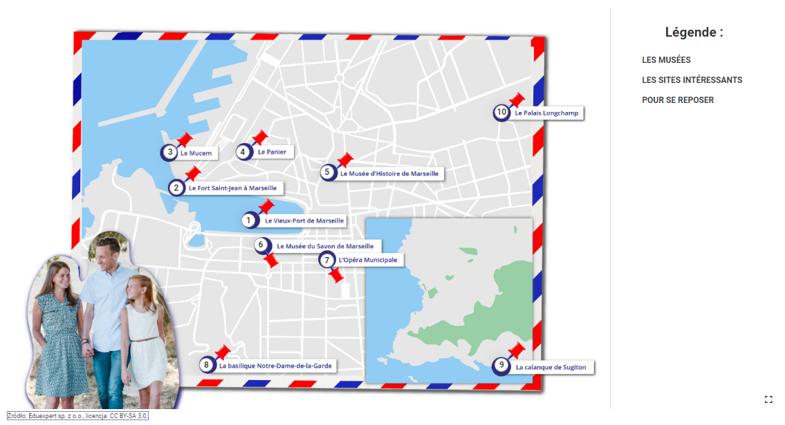 Ilustracja składa się z mapy Marsylii z dziesięcioma zaznaczonymi miejscami. Przy każdym z miejsc znajduje się punkt do kliknięcia z dodatkowymi informacjami w postaci grafiki i nagrania dźwiękowego z transkrypcją.