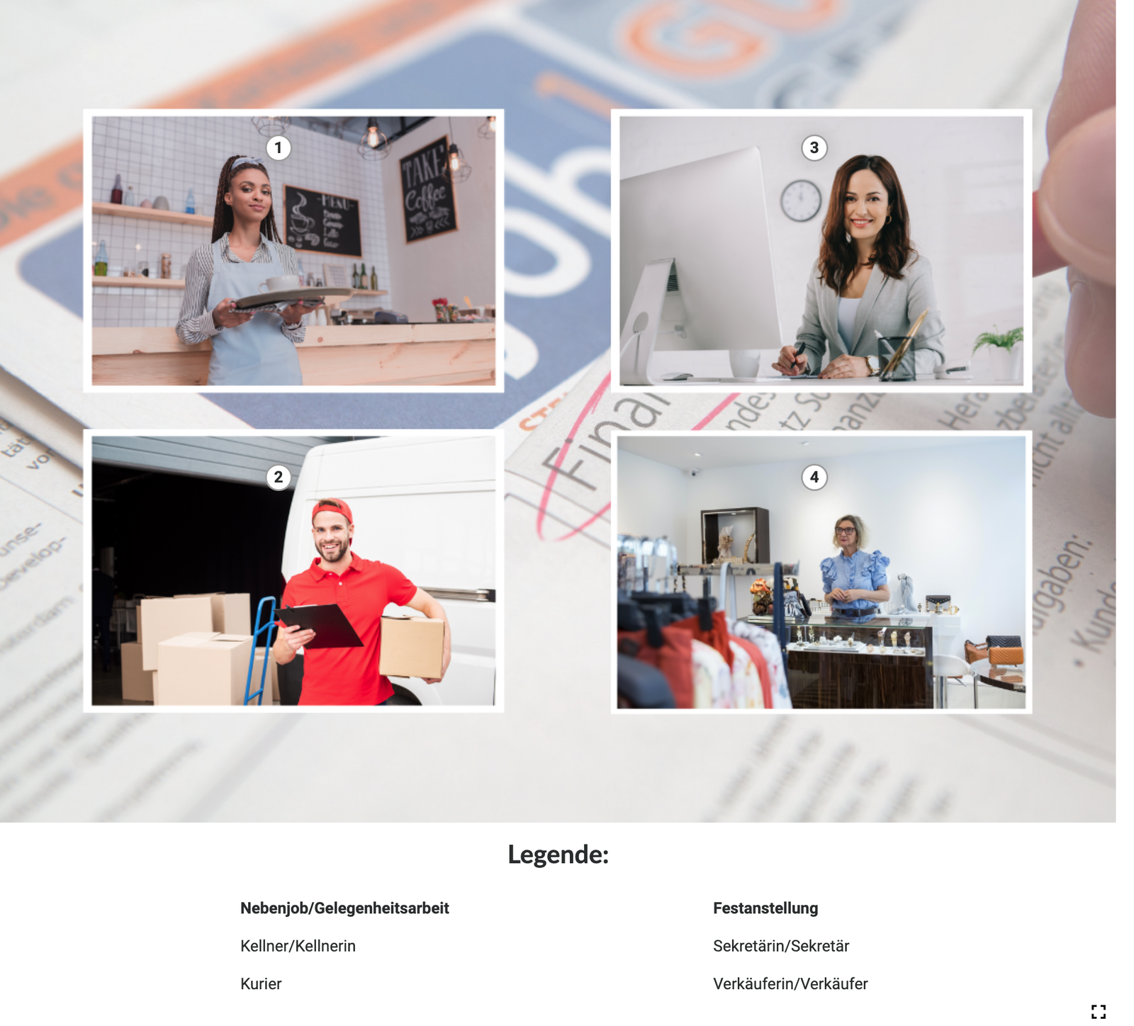 Widoczne są cztery fotografie. Przedstawiają ludzi wykonujących różne zawody: kelnerki, kuriera, sekretarki oraz sprzedawczyni. Przy każdej fotografii znajduje się nagranie dźwiękowe.