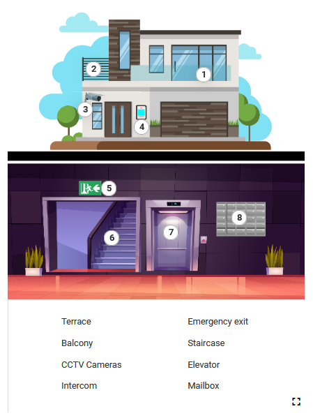 Ilustracja interaktywna podzielona jest na dwie grafiki. Górna grafika przedstawia jednopiętrowy budynek mieszkalny. Na parterze, po lewej stronie, widoczne są dwuskrzydłowe drzwi wejściowe, po których lewej stronie znajduje się pionowe okno, nad którym umieszczona jest kamera, zaś po prawej stronie widoczny jest domofon. Po prawej stronie parteru widoczny jest duży, poziomy prostokąt symbolizujący drzwi do garażu. Na piętrze, od lewej strony, widoczna jest barierka balkonu, pionowy segment z wąskim i wysokim oknem oraz segment z małym i dużym oknem tarasowym. Na grafice znajdują się punkty interaktywne z numerami od 1 do 4. Po naciśnięciu numerka można przeczytać napis w języku angielskim oraz odsłuchać nagranie przypisane do punktu interaktywnego. Punkt nr 1 – Terrace, punkt nr 2 – Balcony, punkt nr 3 – CCTV, punkt nr 4 – Intercom. Dolna grafika przedstawia klatkę budynku mieszkalnego. Po lewej stronie widoczne jest wejście ze schodami prowadzącymi na górę. Nad wejściem widoczne jest oznaczenie wyjścia ewakuacyjnego w postaci zielonego prostokąta, w który wpisana jest postać człowieka biegnącego w lewo przez drzwi oraz strzałka skierowana w lewo. Na prawo od schodów znajduje się winda oraz skrzynki na listy umieszczone na ścianie. Na grafice znajdują się punkty interaktywne z numerami od 5 do 8. Po naciśnięciu numerka można przeczytać napis w języku angielskim oraz odsłuchać nagranie przypisane do punktu interaktywnego. Punkt nr 5 – Emergency exit, punkt nr 6 – Staircase, punkt numer 7 – Elevator, punkt nr 8 – Mailbox. Transkrypcja do nagrań znajduje się poniżej.