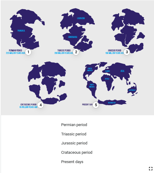 Ilustracja składa się z sześciu map przedstawiających pradawne kontynenty. Ilustracja zawiera pięć punktów interaktywnych, po naciśnięciu których pojawia się nagranie. Transkrypcja nagrań znajduje się poniżej.