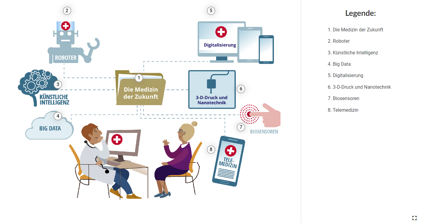 Welche Begriffe beschreiben die Medizin der Zukunft? Markiere anhand der Informationen in der interaktiven Illustration.