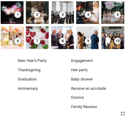 Ilustracja złożona jest z 10 zdjęć, ułożonych w dwóch wersach, w każdym po pięć. Do każdego zdjęcia został przypisany numer, od 1 do 10. Od lewej, u góry, zdjęcie przedstawia kolorowe sztuczne ognie - z przypisanym numerem 1. Na prawo, zdjęcie przedstawia rodziców i dwoje dzieci przy stole. Kobieta i dzieci siedzą, a mężczyzna stoi i kroi pieczonego indyka - z przypisanym numerem 2. Na prawo, zdjęcie przedstawia salę z dużymi oknami, a na pierwszym planie grupa stojących uczniów w czarnych togach i z nakryciami na głowie, którzy sypią confetti - z przypisanym numerem 3. Na prawo, zdjęcie przedstawia po prawej mężczyznę kucającego przed siedzącą na fotelu kobietą. W tle widoczny niski stolik, na którym stoi wazon z bukietem czerwonych róż oraz kieliszki z czerwonym winem - z przypisanym numerem 4. Na prawo, zdjęcie przedstawia grupę stojących młodych dziewczyn, ubranych w białe i różowe sukienki z ogromnym pękiem różowych i białych balonów - z przypisanym numerem 5. Od lewej, u dołu, zdjęcie przedstawia młodą parę stojącą przy stole przykrytym białym obrusem, na którym stoi wielki tort pośrodku. W tle widoczne żółte, białe i różowe balony i dekoracje - z przypisanym numerem 6. Na prawo, zdjęcie przedstawia pocztówkę, na której lewej stronie widoczne są czerwone serca z napisami, a po prawej stronie leżą cztery czerwone róże - z przypisanym numerem 7. Na prawo, zdjęcie przedstawia cztery stojące osoby. Dwie po lewej to starsi mężczyźni w garniturach, dwie po prawej to młode kobiety. Jeden z mężczyzn i kobieta klaszczą, natomiast drugi mężczyzna ściska rękę kobiety - z przypisanym numerem 8. Na prawo, zdjęcie przedstawia trzy stojące osoby, po lewej kobietę odwróconą w lewo, po prawej mężczyznę odwróconego w prawo, a pośrodku mężczyznę stojącego przodem - z przypisanym numerem 9. Na prawo, zdjęcie przedstawia grupę osób w różnym wieku, od najmłodszych do najstarszych, którzy stoją przed wejściem do budynku.