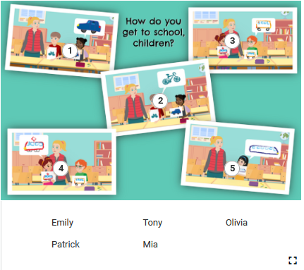 Grafika składa się z pięciu ilustracji umieszczonych na tablicy, każda zawiera inny środek lokomocji, z którego korzystają dzieci w drodze do szkoły. Ilustracje posiadają punkty interaktywne, po naciśnięciu których pojawia się tekst oraz nagrania. Transkrypcja do nagrań znajduje się poniżej.