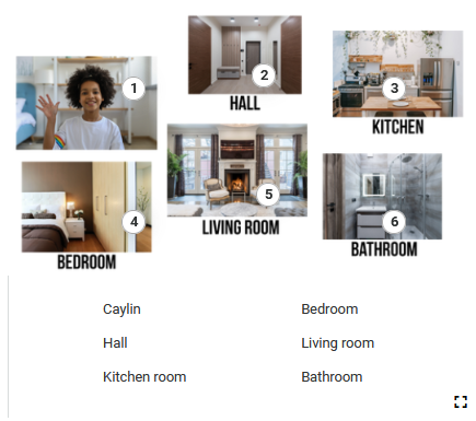 Ilustracja składa się z sześciu zdjęć wnętrza domu. Każde ze zdjęć posiada punkty interaktywne, po naciśnięciu których pojawiają się tekst oraz nagrania. Transkrypcja do nagrań znajduje się poniżej.