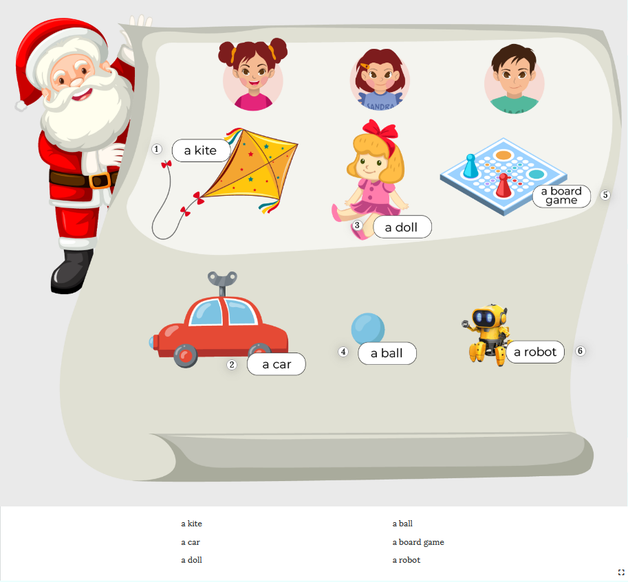 Ilustracja interaktywna przedstawia rozwinięty zwój papieru, na którym znajdują się ilustracje zabawek. W prawym górnym rogu ilustracji, zza kartki wychyla się Święty Mikołaj w czerwonej czapce z białym futerkiem i pomponem, z białą brodą i wąsem, ubrany w czerwony strój z brązowym pasem. Ilustracje na kartce ustawione są w trzech kolumnach. Nad każdą kolumną znajduje się postać dziecka. W kolejności od lewej jest to: Mia, Sandra oraz Jack. Każda kolejna zabawka posiada punkt interaktywny, który wyświetla ramkę z tekstem oraz nagraniem dźwiękowym. Transkrypcja nagrań dźwiękowych znajduje się pod ilustracją.