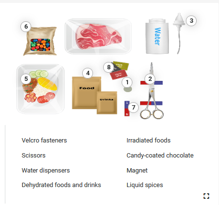 Grafika przedstawia osiem przedmiotów ułożonych na białym tle, do których przypisane są treści oznaczone kolejnymi numerami od 1 do 8. W górnej części, od lewej strony widoczne jest opakowanie z kolorowymi drażami - z przypisanym numerem 6. Na prawo widoczny jest stek na białej plastikowej tace, przykryty przeźroczystą folią. Na prawo widoczny jest cylindryczny, biały pojemnik z napisem z niebieskich liter w języku angielskim Water, obok którego znajduje się korek z rurką - z przypisanym numerem 3. Poniżej, od lewej, widoczna jest biała prostokątna tacka, na której widoczne są plastry pomidora, ogórka, papryki, kupka ryżu, żółte warzywo, galaretka - z przypisanym numerem 5. Na prawo widoczne są dwie prostokątne, brązowe torebki zamykane na zip, na większej widoczny jest napis z czarnych liter w języku angielskim Food, na mniejszej - Drinks - z przypisanym numerem 4. Powyżej, na prawo, widoczne są trzy prostokąty symbolizujące małe opakowania, w kolorze czarnym, czerwonym i zielonym z napisami z białych liter w języku angielskim: Liquid spices - z przypisanym numerem 8. Poniżej szary owal - z przypisanym numerem 1. Poniżej prostokąt podzielony na połowę, z której dolna jest czerwona z białą literą N, a górna niebieska z białą literą S - z przypisanym numerem 7. Na prawo widoczne są duże metalowe nożyczki - z przypisanym numerem 2.