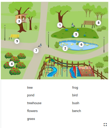 Ilustracja przedstawia park, w którym zaznaczono ciekawe atrakcje. Posiada ona dziewięć punktów interaktywnych, po naciśnięciu których pojawiają się nagrania. Transkrypcja do nagrań znajduje się poniżej.
