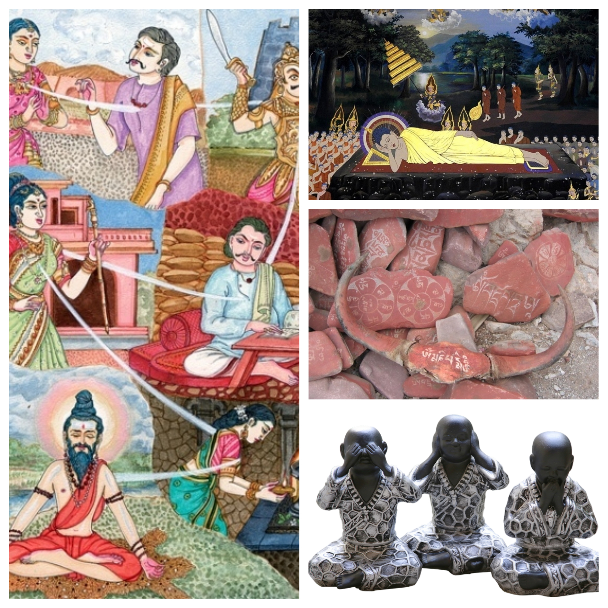 A word which literally means extinction. In Buddhism, it is a state signifying the extinction of suffering., This is a cause – understood in the sense of the law of cause and effect., An expression, verse or syllable, which is an element of spiritual practise. Repeating a mantra helps to take control of the mind, activate certain energies, calm and cleanse of impurity., The belief that a soul (or consciousness) can be born again into a new physical being after the death of its body.