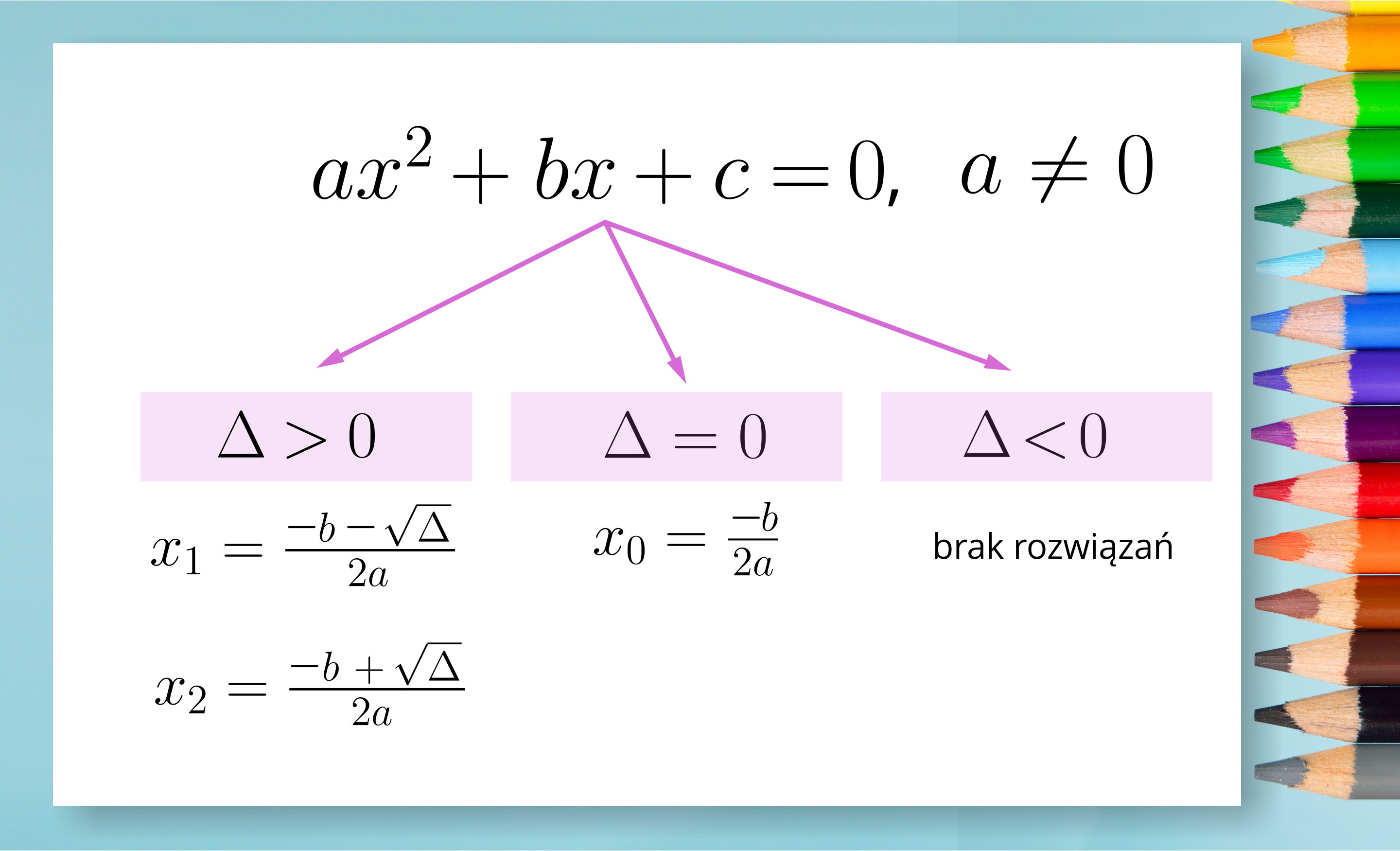 Zapoznaj się z infografiką przedstawiającą klasyfikację równań kwadratowych ze względu na liczbę rozwiązań.