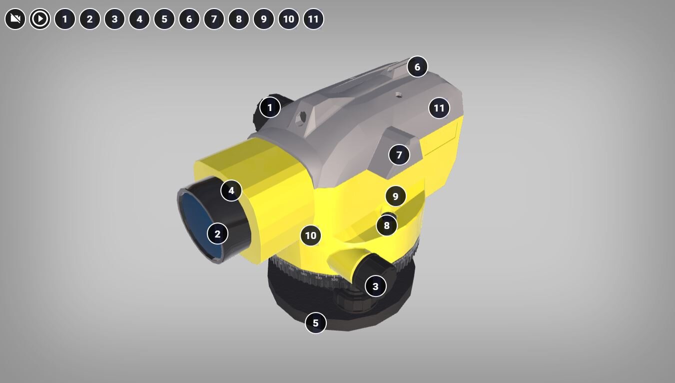 Wizualizacja trzy de ukazuje budowę niwelatora optycznego, umożliwia obserwację tego instrumentu w pełnej panoramie z zewnątrz, z perspektywy obserwatora obchodzącego obiekt wokół. Każdy element przedstawionego urządzenia został podpisany przy użyciu znacznika w postaci kółka z cyfrą w środku. Po kliknięciu znacznika wyświetla się pole tekstowe z nazwą elementu oraz pasek odtwarzania. Nagrania audio są tożsame z treścią podpisów.