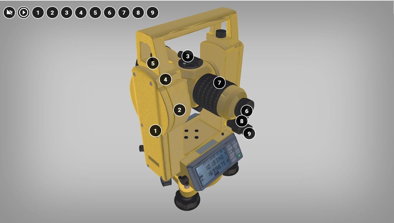 Wizualizacja trzy de ukazuje budowę teodolitu, umożliwia obserwację tego instrumentu w pełnej panoramie z zewnątrz, z perspektywy obserwatora obchodzącego obiekt wokół. Każdy element przedstawionego urządzenia został podpisany przy użyciu znacznika w postaci kółka z cyfrą w środku. Po kliknięciu znacznika wyświetla się pole tekstowe z nazwą elementu oraz pasek odtwarzania. Nagrania audio są tożsame z treścią podpisów.