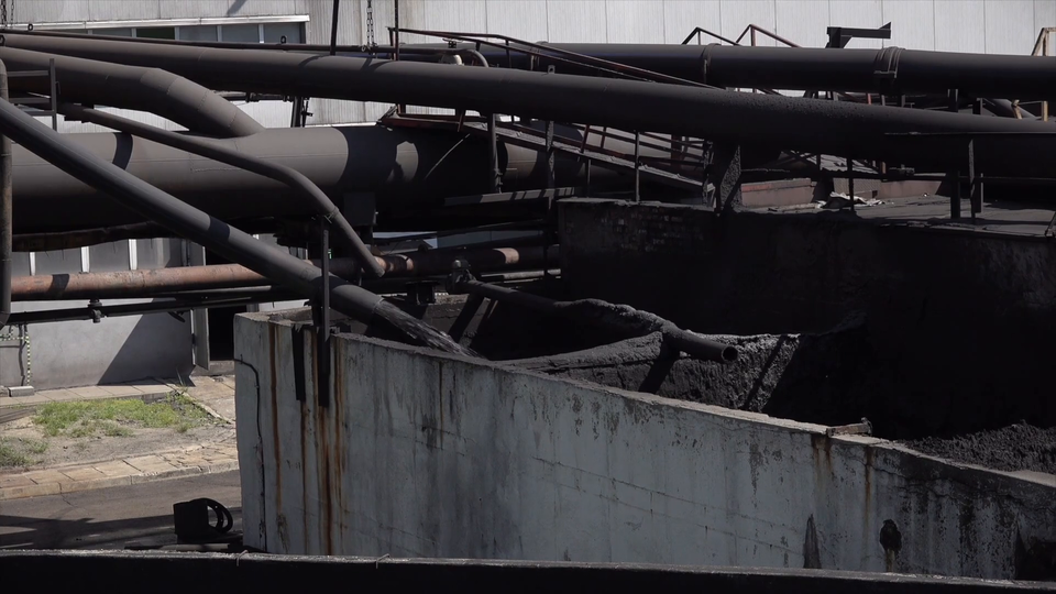 Film przedstawia urządzenie pomocnicze. Znajduje się ono na zewnątrz i jest zabudowane na planie koła. Główną część stanowi zbiornik o znacznej średnicy i niedużej wysokości ścian bocznych. Wokół niego znajduje się pierścieniowata rynna. Nad zbiornikiem poprowadzony jest pomost. Przedstawiono zbliżenia na muł oraz wodę odzyskiwaną w czasie procesu. Jest ona odprowadzana za pośrednictwem rynny i kierowana dalej do odpływu.