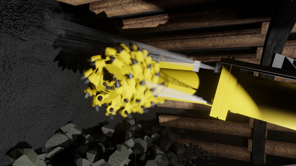 Animacja trzy D przedstawia kombajn chodnikowy podczas urabiania calizny. Po lewej ścianie znajduje się pokład. Natomiast po prawej fragment kombajnu. Składa się on z ramienia. Na nim zamontowana jest głowica urabiająca. Ma ona obły kształt, a na całym jej korpusie zamontowane są noże. W maszynie zastosowano rozwiązania technologiczne ograniczające zagrożenie wybuchem pyłu węglowego. Zza głowicy zgodnie z osią ramienia kierowany jest natrysk wody. Woda przepływa z płaszcza wodnego bębna wysokociśnieniowymi wężami do otworu w wale głównym, skąd trafia do dysz.