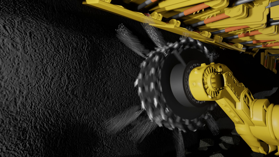 Animacja trzy D przedstawia kombajn ścianowy podczas urabiania calizny. Wpierw fragment obudowy mechanicznej. Dalej po lewej stronie pokład. Natomiast po prawej fragment kombajnu. Składa się on z ramienia. Na nim zamontowana jest głowica urabiająca. Ma ona walcowaty kształt, na jej obwodzie zamontowane są noże. W maszynie zastosowano rozwiązania technologiczne ograniczające zagrożenie wybuchem pyłu węglowego. Zza pojedynczego noża, równolegle do niego oraz zgodnie z jego ruchem kierowany jest natrysk wody. Woda przepływa z płaszcza wodnego bębna wysokociśnieniowymi wężami do otworu w wale głównym, skąd trafia do dysz.